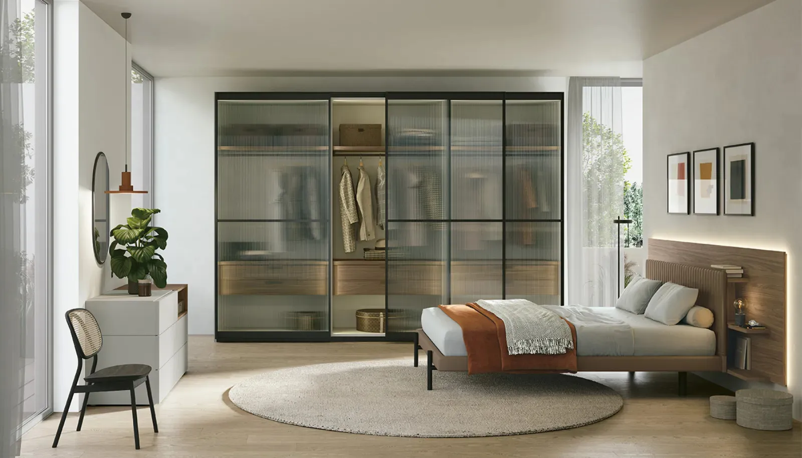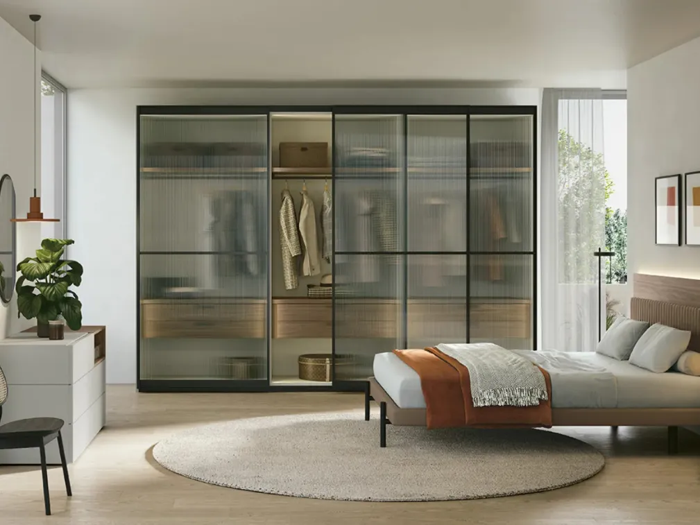 Cerchi un'armadiatura in vetro? Clicca e scopri armadiature a muro con ante scorrevoli di Dielle Modus.