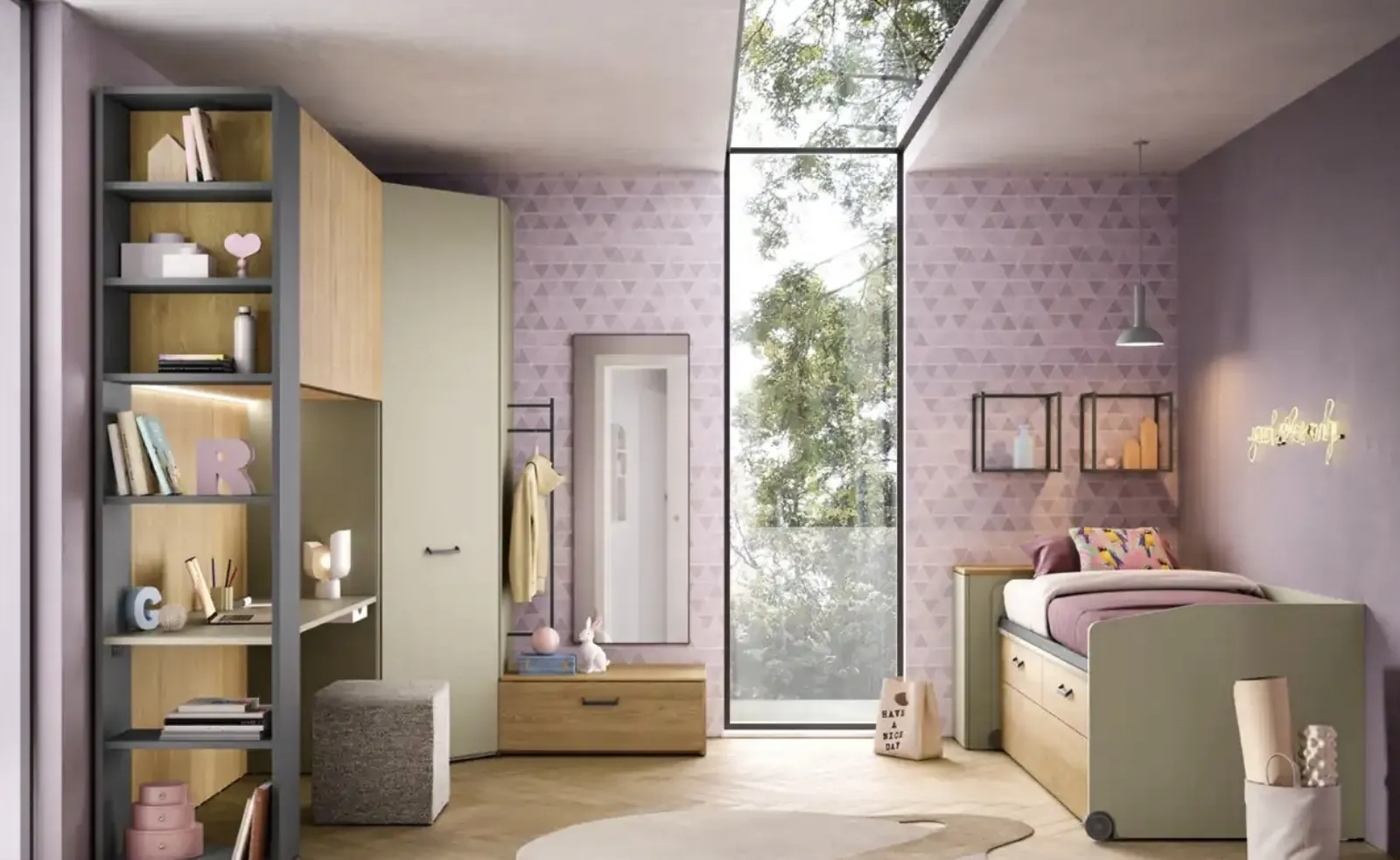 Arreda stanzette moderne con le Camerette a ponte Moretti Compact Camerette! Il modello K122 in laccato opaco è per bambine.