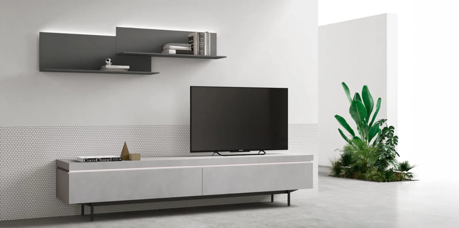 In una ricca serie di Mobili Porta Tv moderni a firma Maronese, prende particolare valore il modello in melaminico visibile in foto, mix di praticità e design.