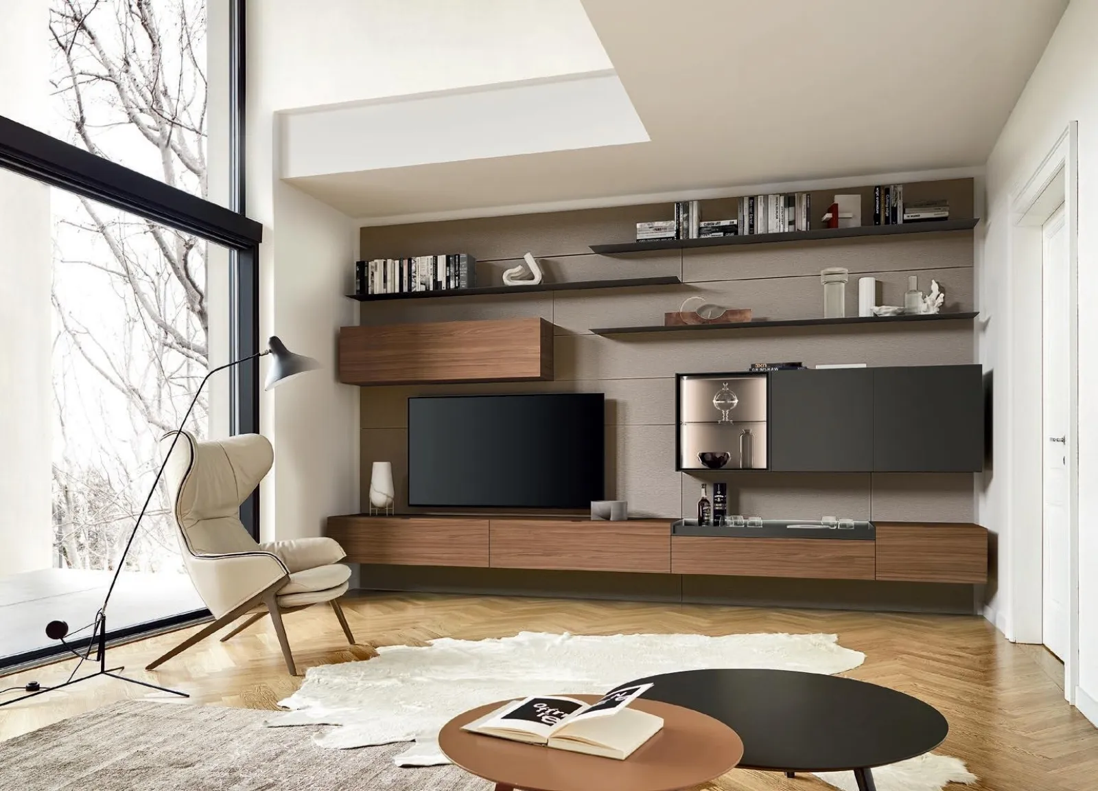 Questa parete attrezzata è una delle soluzioni dell'azienda e ti permetterà di allestire il living seguendo le più personali problematiche abitative. Le Pareti Attrezzate hanno assunto un posto fondamentale nella zona giorno delle nostre case: sono mobili plurifunzionali e salvaspazio sempre realizzabili su misura. Attraverso un gioco dinamico di accostamenti fra elementi a giorno o vani chiusi, le Pareti Attrezzate moderne arredano il soggiorno valorizzando ogni spazio.