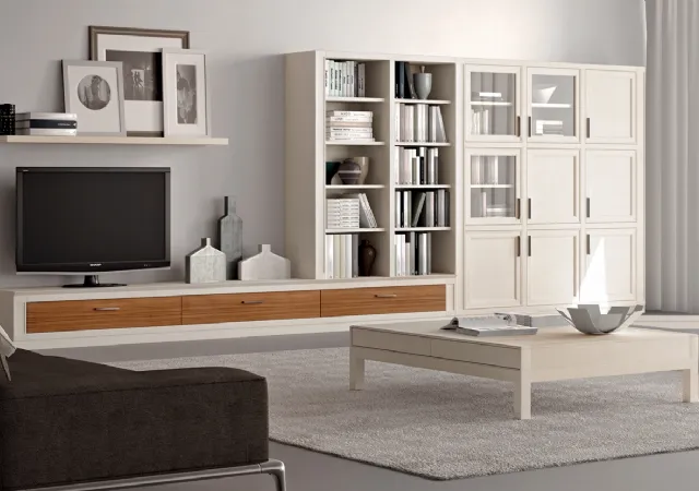 Vuoi arredare un soggiorno dinamico e operativo? Ecco a te la parete attrezzata Melograno composizione 15 Le Fablier dalle linee decise classiche.