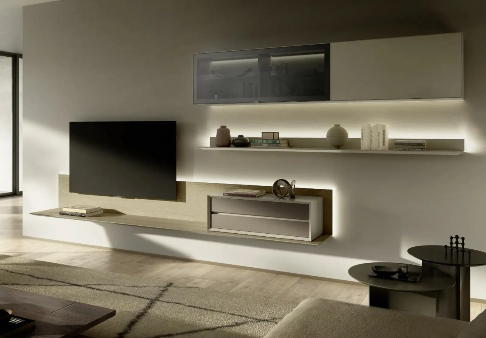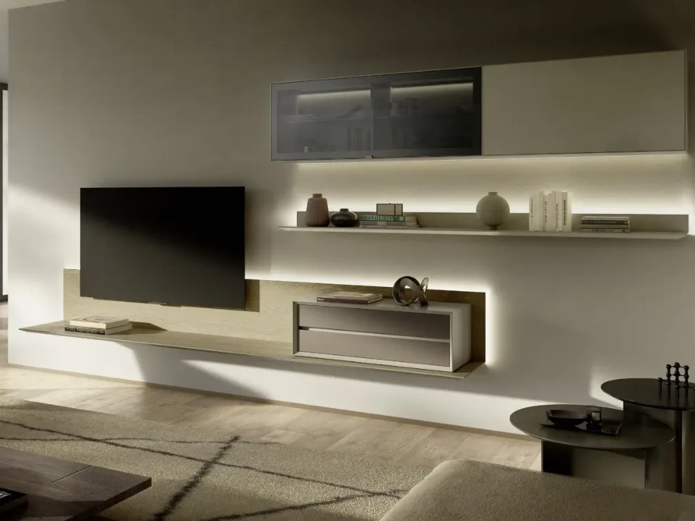 Se desideri ultimare un soggiorno pratico e operativo dalle linee moderne, ecco a te la parete attrezzata Domino 02 Sangiacomo.