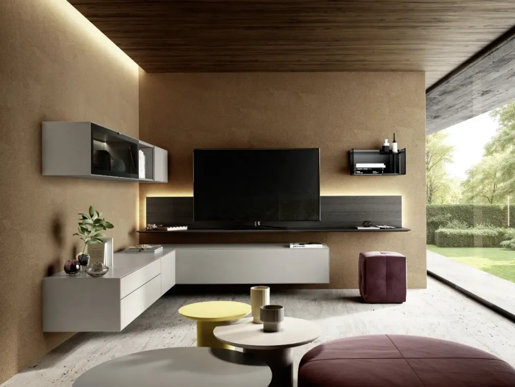 Vuoi arredare un soggiorno operativo e pratico? Ti presentiamo la parete attrezzata Domino 05 Sangiacomo dalle linee decise moderne.