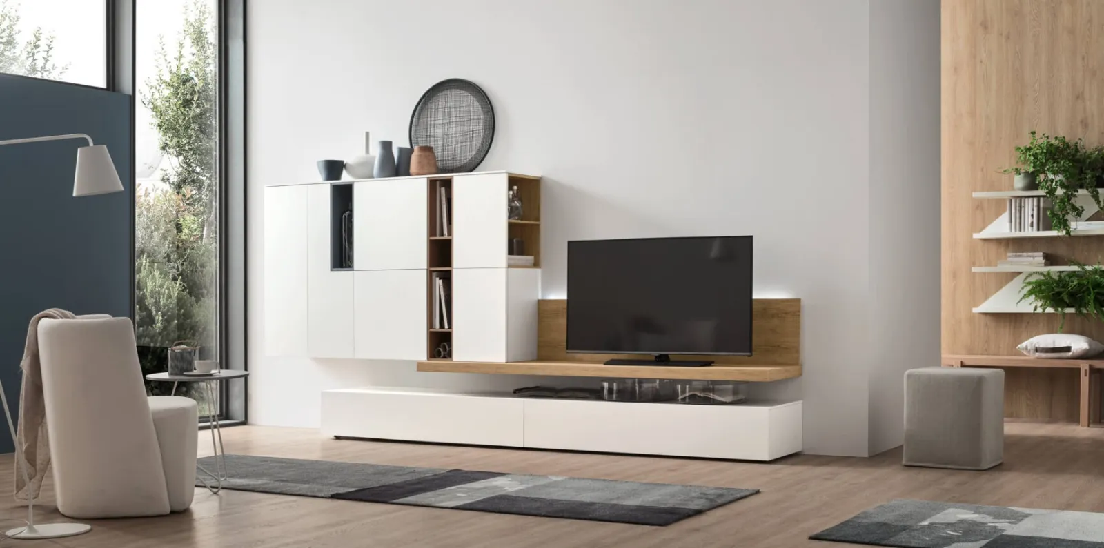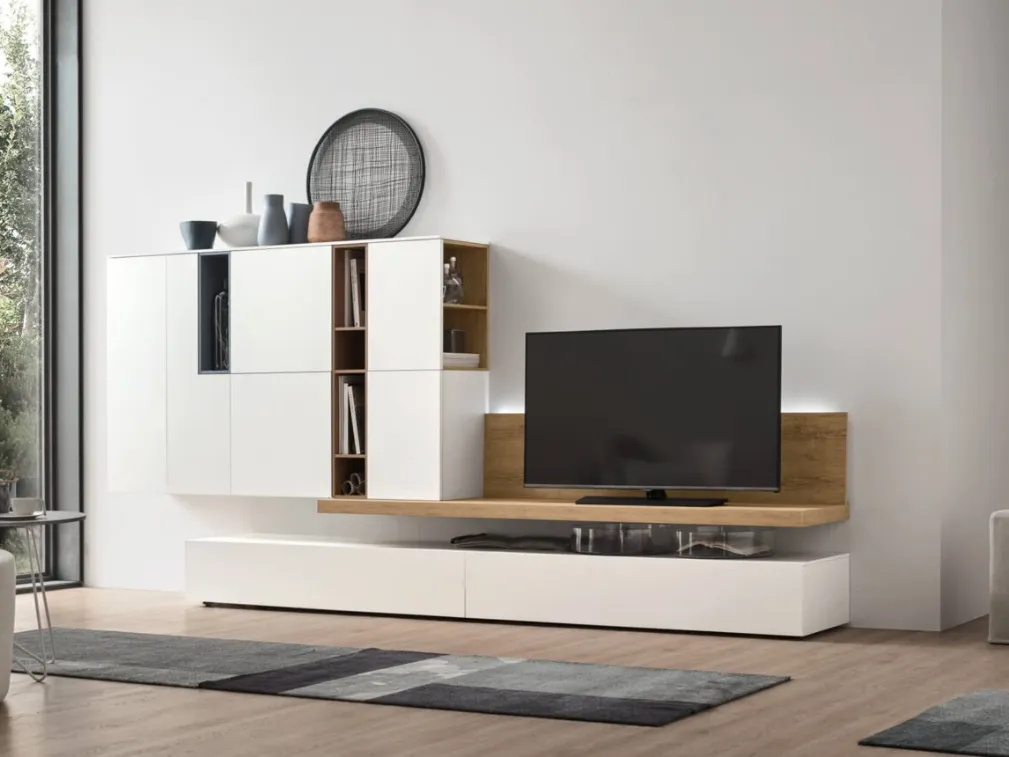 Anche in un living di dimensioni contenute, questo tipo di arredo riesce a organizzare al meglio gli spazi sfruttando bene ogni angolo e assicurando componibilità personalizzabile tipica delle soluzioni moderne. Se cerchi arredi salvaspazio e realizzabili su misura, contattaci e ottieni informazioni sull'Arredamento Casa delle migliori marche. Questa soluzione costituisce tutta la qualità che il brand assicura grazie a pluriennale esperienza e grande passione nel settore dell'arredo e del design. La Parete Attrezzata Unix Comp SU2104 di Maronese nella fotografia, con finitura in melaminico, risolve le più personali esigenze abitative di spazio e stile senza rinunciare alla ricerca estetica.