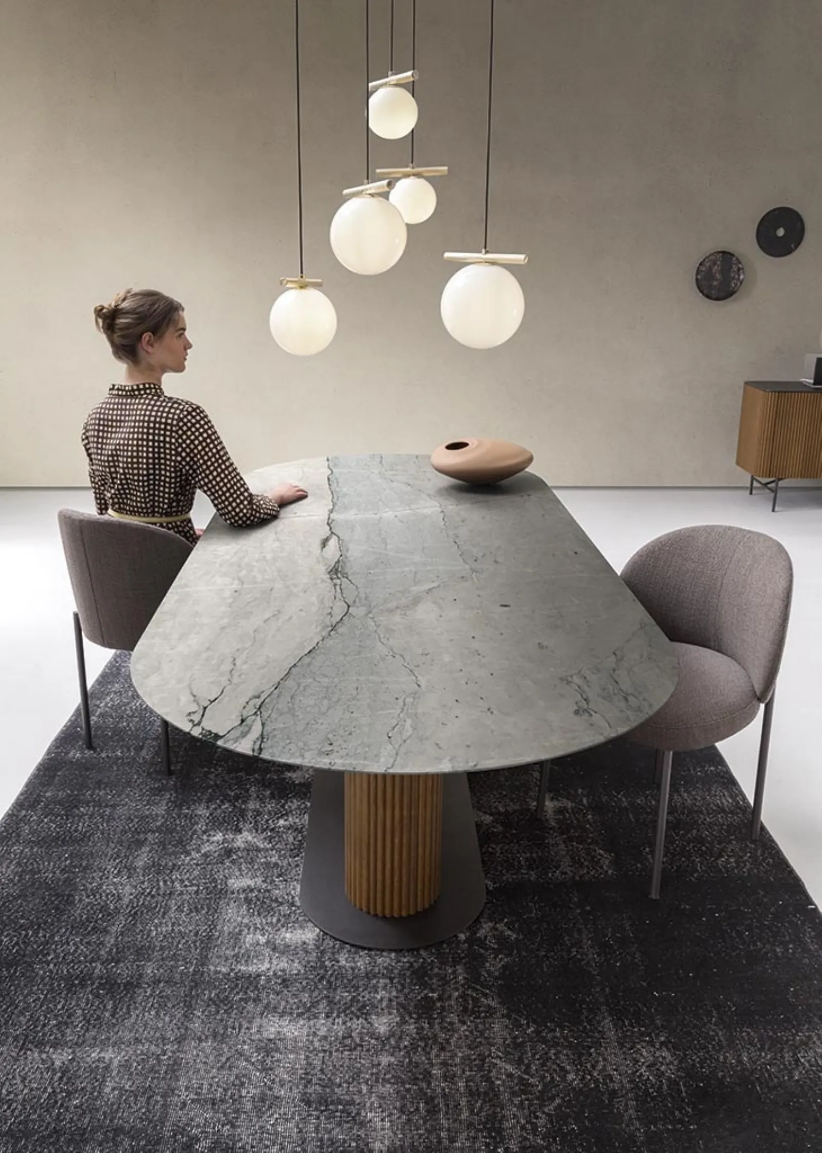 Un modello come quello nella fotografia, in abbinamento alle giuste sedute, saprà valorizzare il look delle stanze domestiche dedicate per eccellenza alla socializzazione. Se cerchi un tavolo da pranzo di alto contenuto estetico, contattaci e ricevi informazioni e preventivi sul modello presente in foto. Tavolo Rigadin in pietra di Alf Da Frè: realizzato in materiali di prima scelta è contraddistinto dalle linee decise del top e da un basamento ricercato ed elegante. Ideali per dare vita a degli abbinamenti unici con sedute e complementi design, i Tavoli fissi dell'azienda sono soluzioni tra le più esclusive in commercio, ideali per il soggiorno e la cucina.