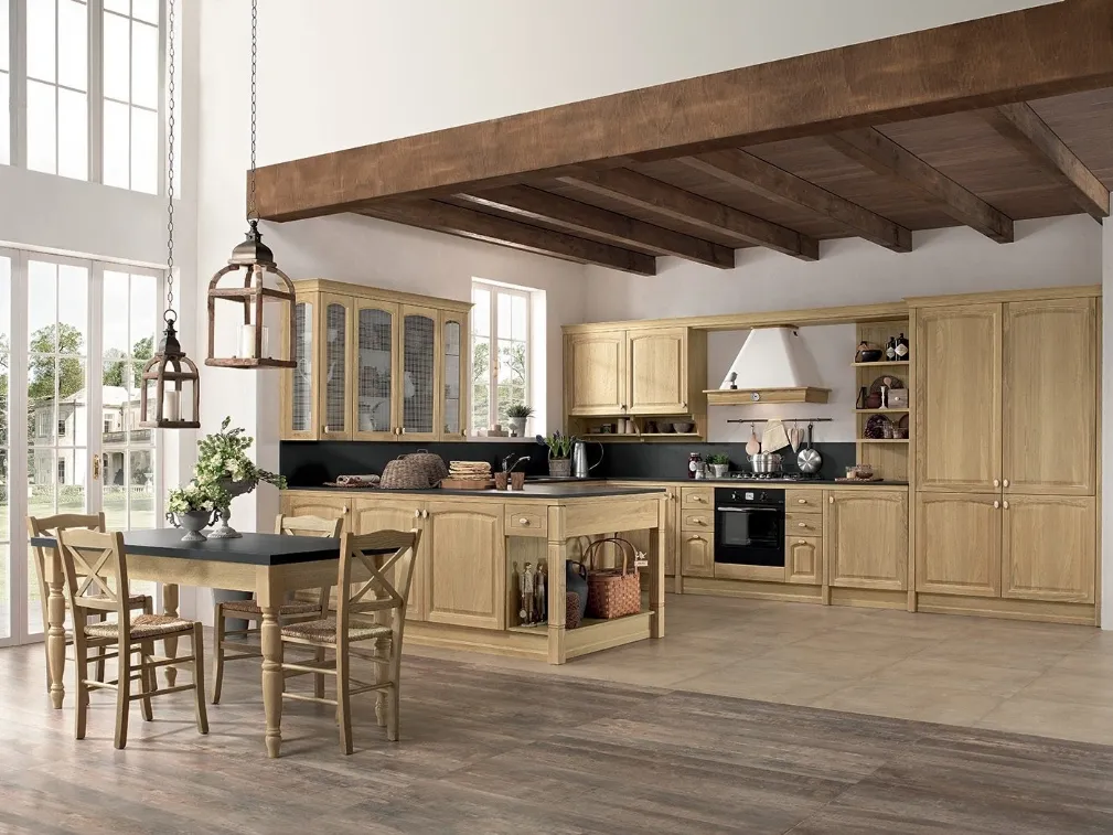 La Cucina Classica con penisola Mida 05 di Colombini Kitchen nella fotografia presenta un mood accogliente, elegante e sofisticato, portavoce del tipico aspetto romantico delle Cucine Classiche. Se sei alla ricerca di un prodotto di gusto classico, che duri a lungo nel tempo mantenendo la bellezza originale, opta per una cucina classica in legno resistente e di qualità eccellente, come quella qui presente.