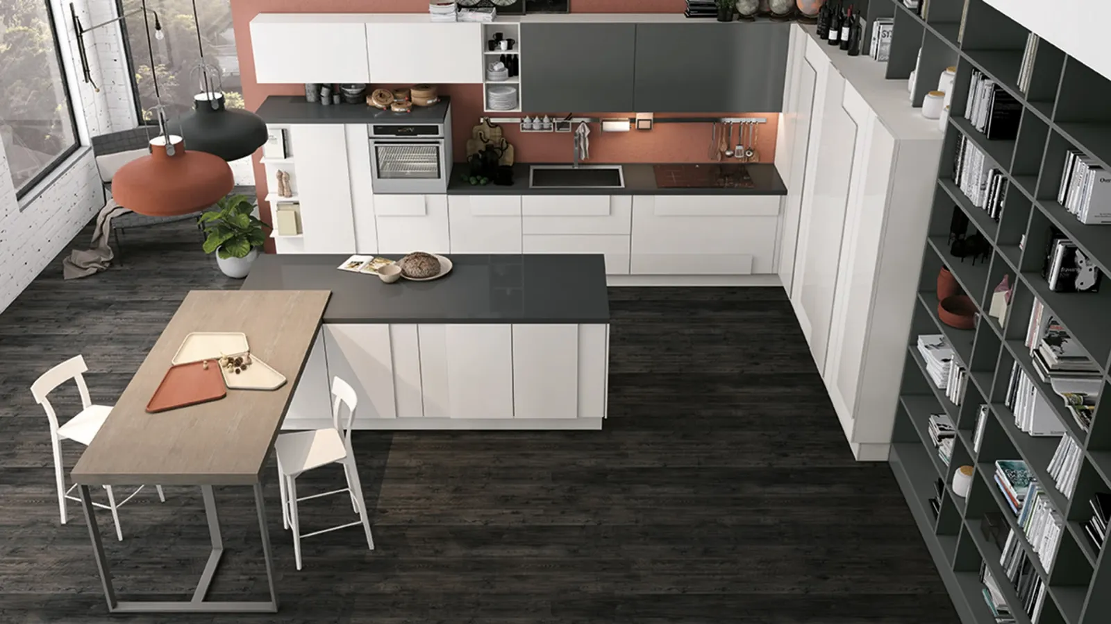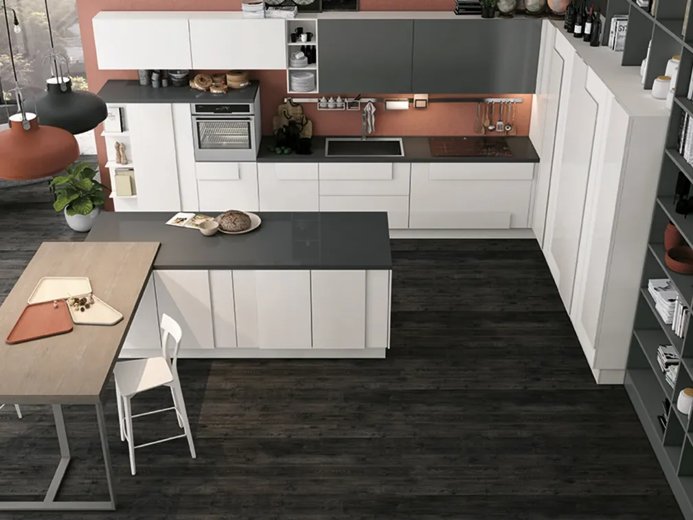 Se desideri una cucina moderna Lube, Creativa 06 in melaminico ti attende nel nostro negozio di Cucine Moderne con isola.
