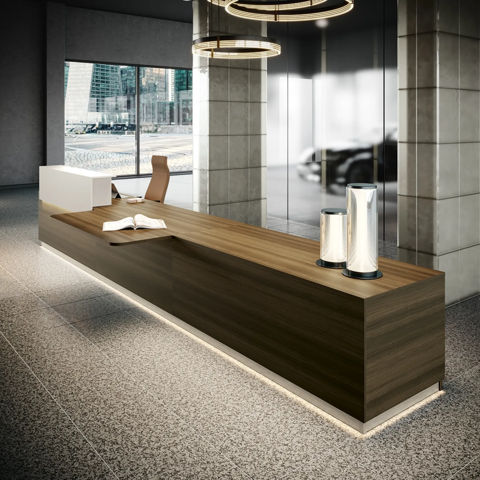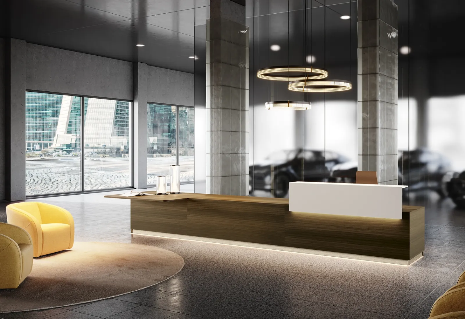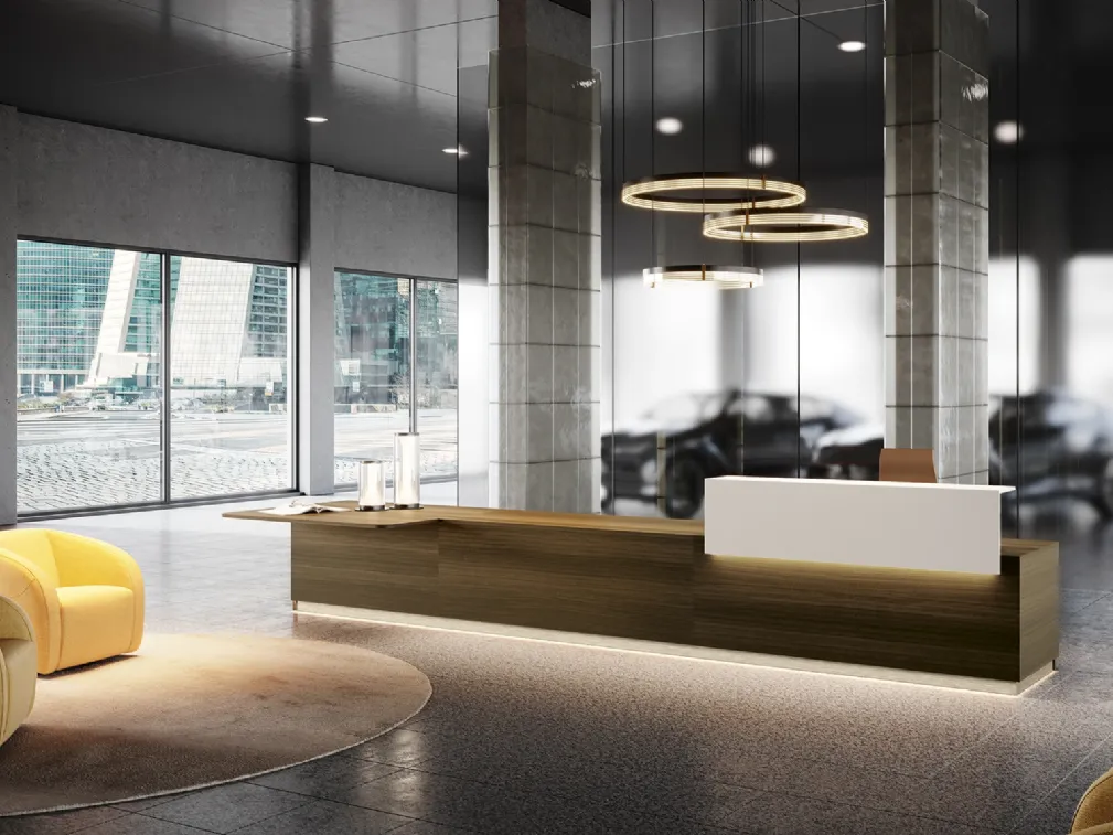 Vuoi arredare l'ambiente lavorativo? Ecco qui differenti proposte di banconi reception in melaminico, come il modello Reception Class 04 di Colombini Office.